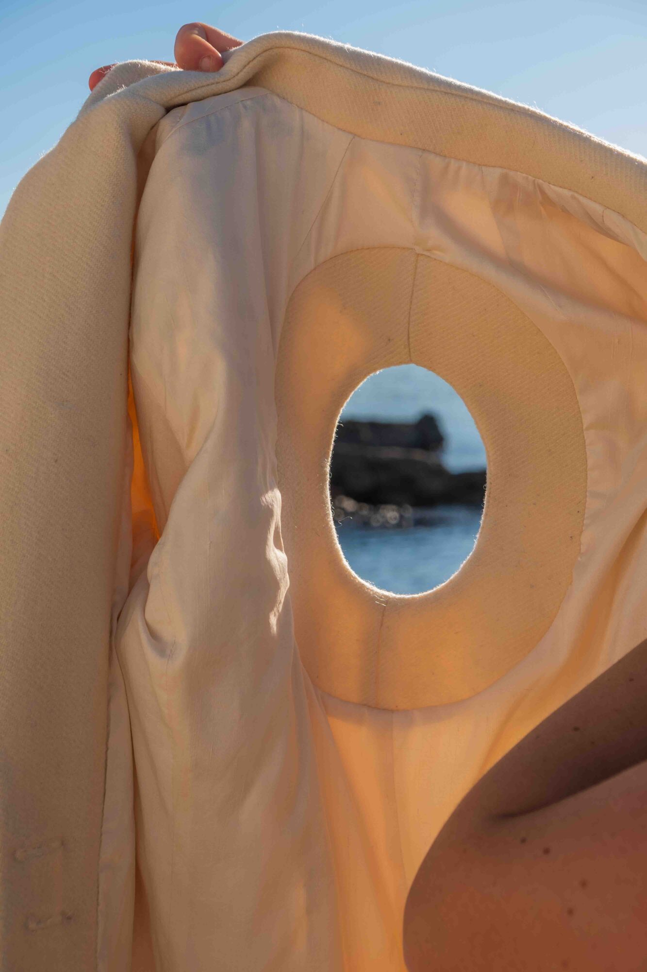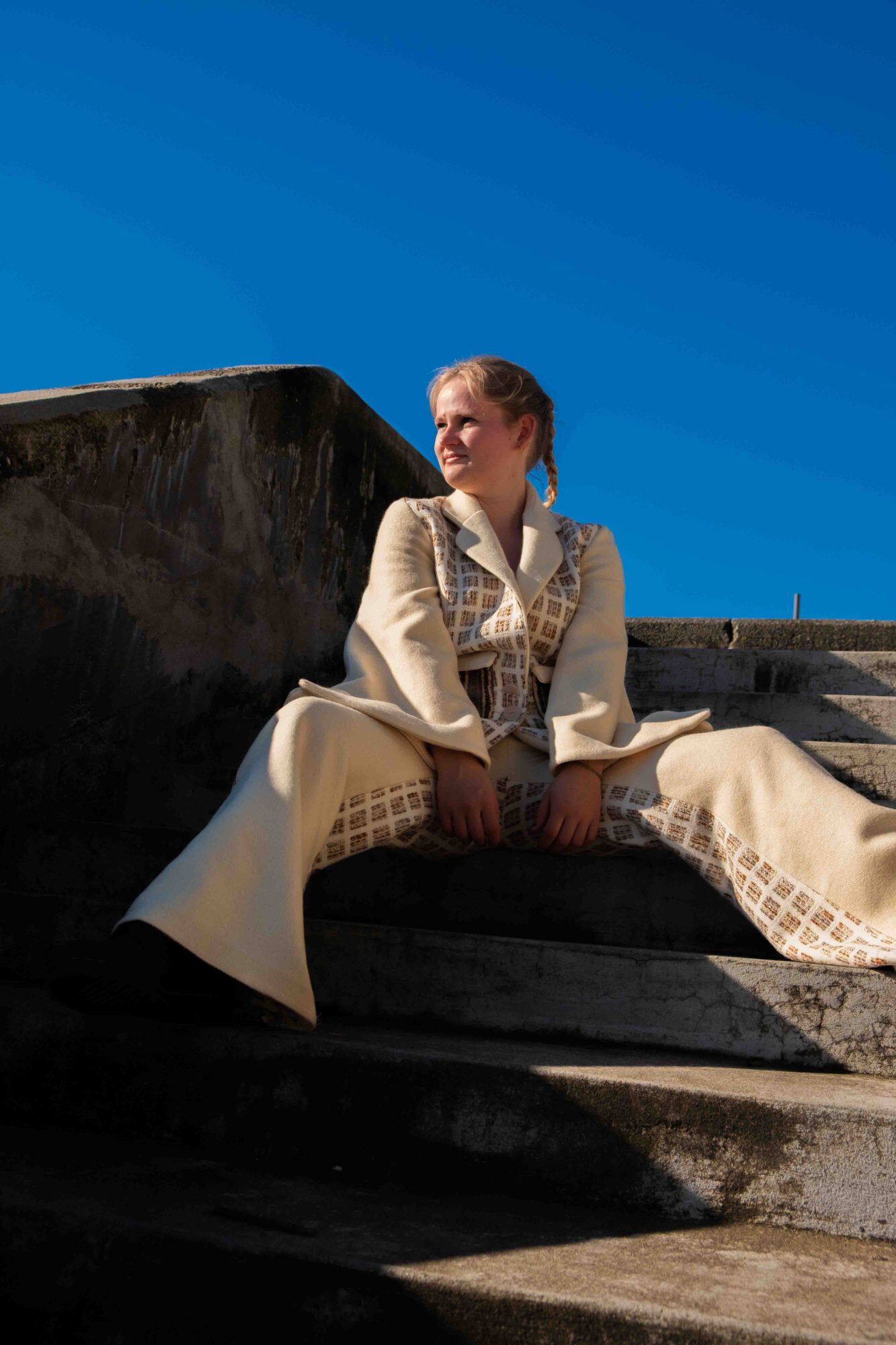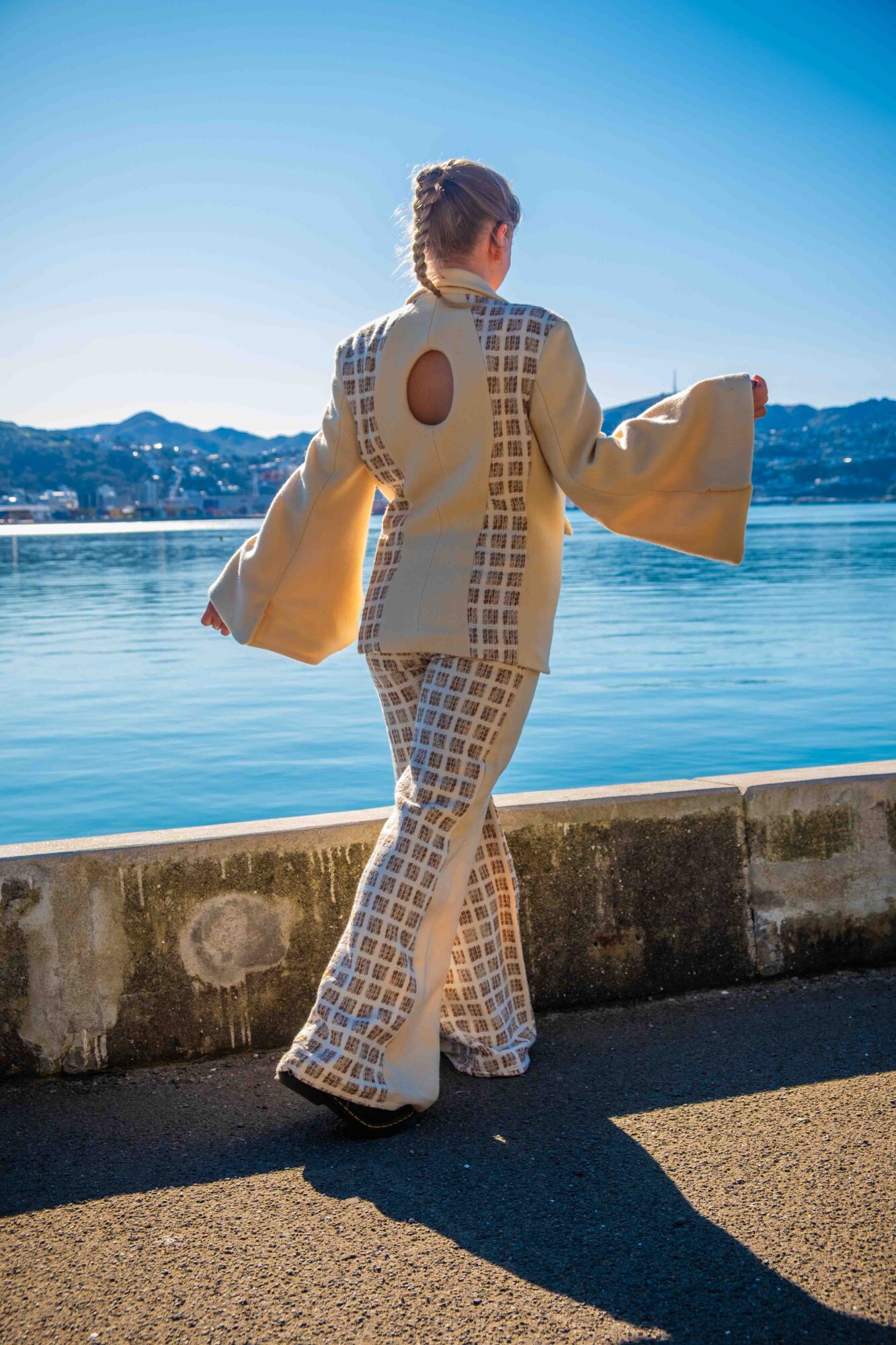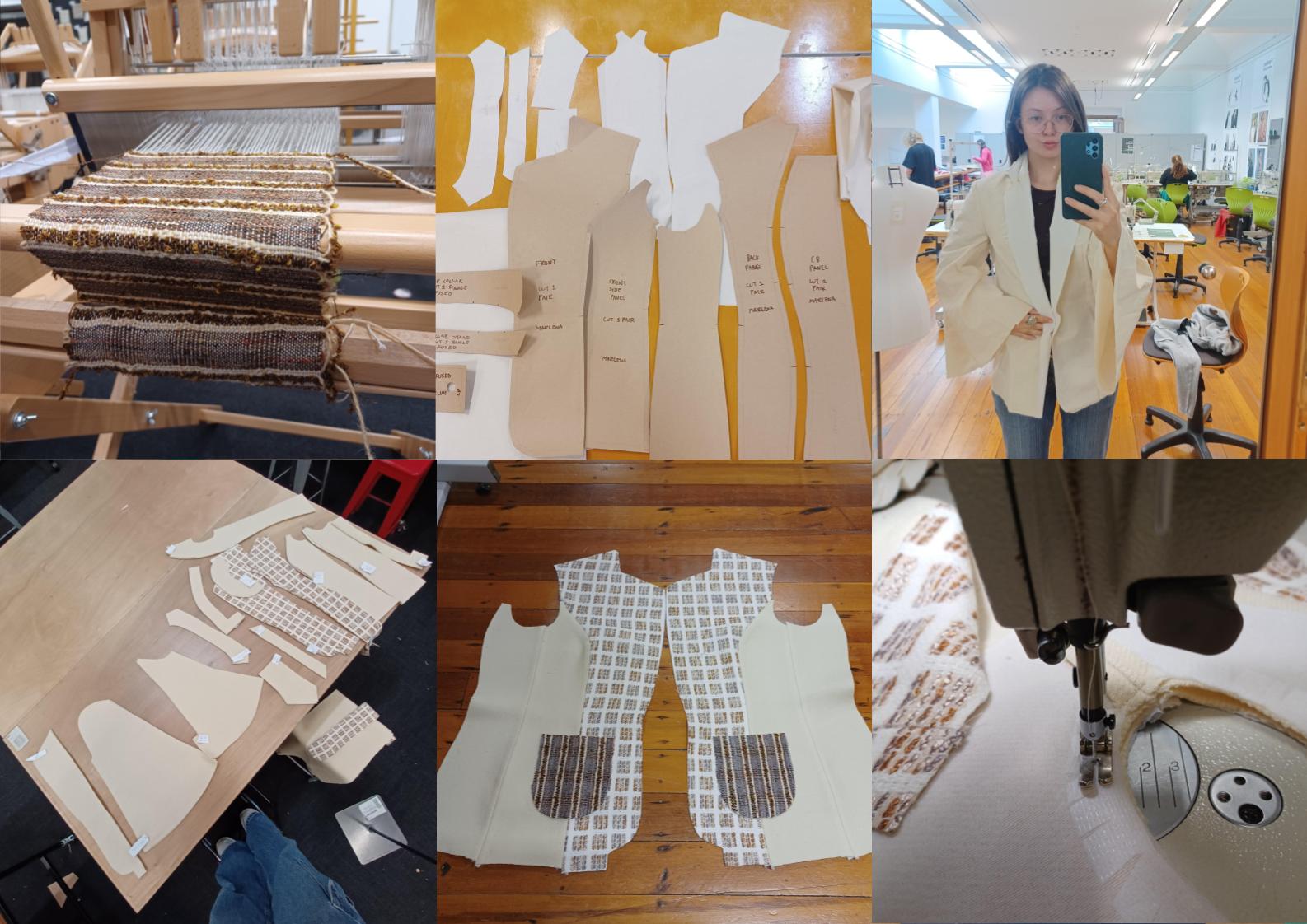 During this project I learnt advanced technical sewing and pattern making skills that pushed me way out of my comfort zone. I learnt how to make a tailored jacket sample first, and then transferred those skills into my own design. I learnt how to sew jetted pockets, lapels, collars, back vent, semi working sleeve vent and lining. The most difficult part was sewing the invisible seam pockets, and the most rewarding part was sewing the lining and back hole facings. Consisting of 34 patten pieces all together, this is my biggest fashion project yet. I also wove my own fabric for the pockets on the 8 shaft loom, using hopsack lifting plan.