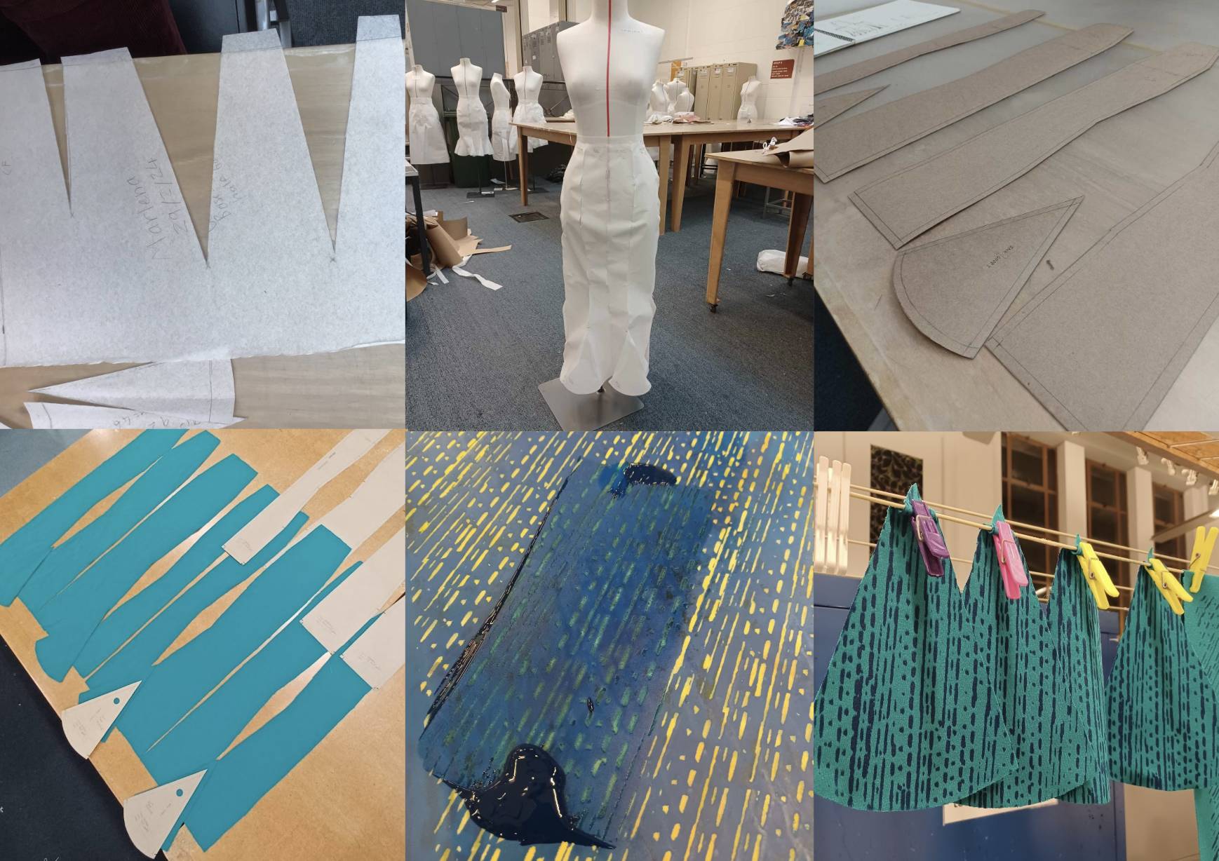 This skirt is a result of my first pattern making class. I went from having zero experience pattern making to suddenly being able to manipulate and change blocks to suit my design. Here I learnt all the fundamental basics and rules. I choose to create a panelled skirt with godets, and sew it up with stretch fabric. I also screen printed the godets with a water drop design I had made for my screen printing class.