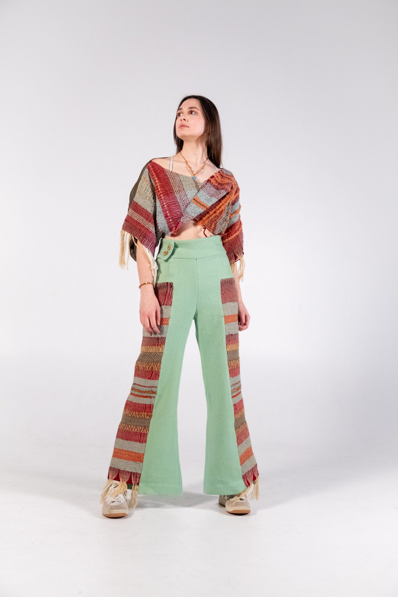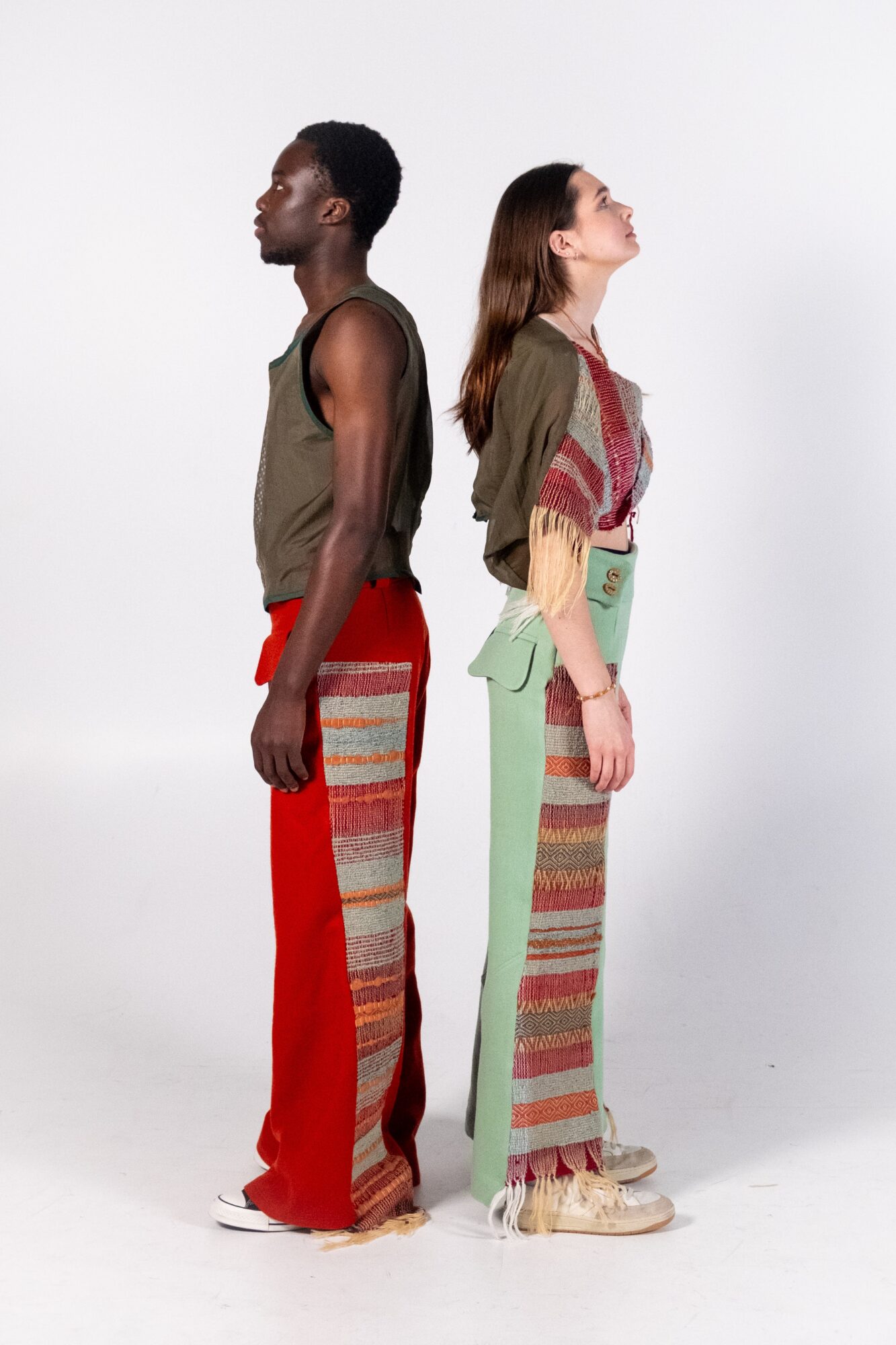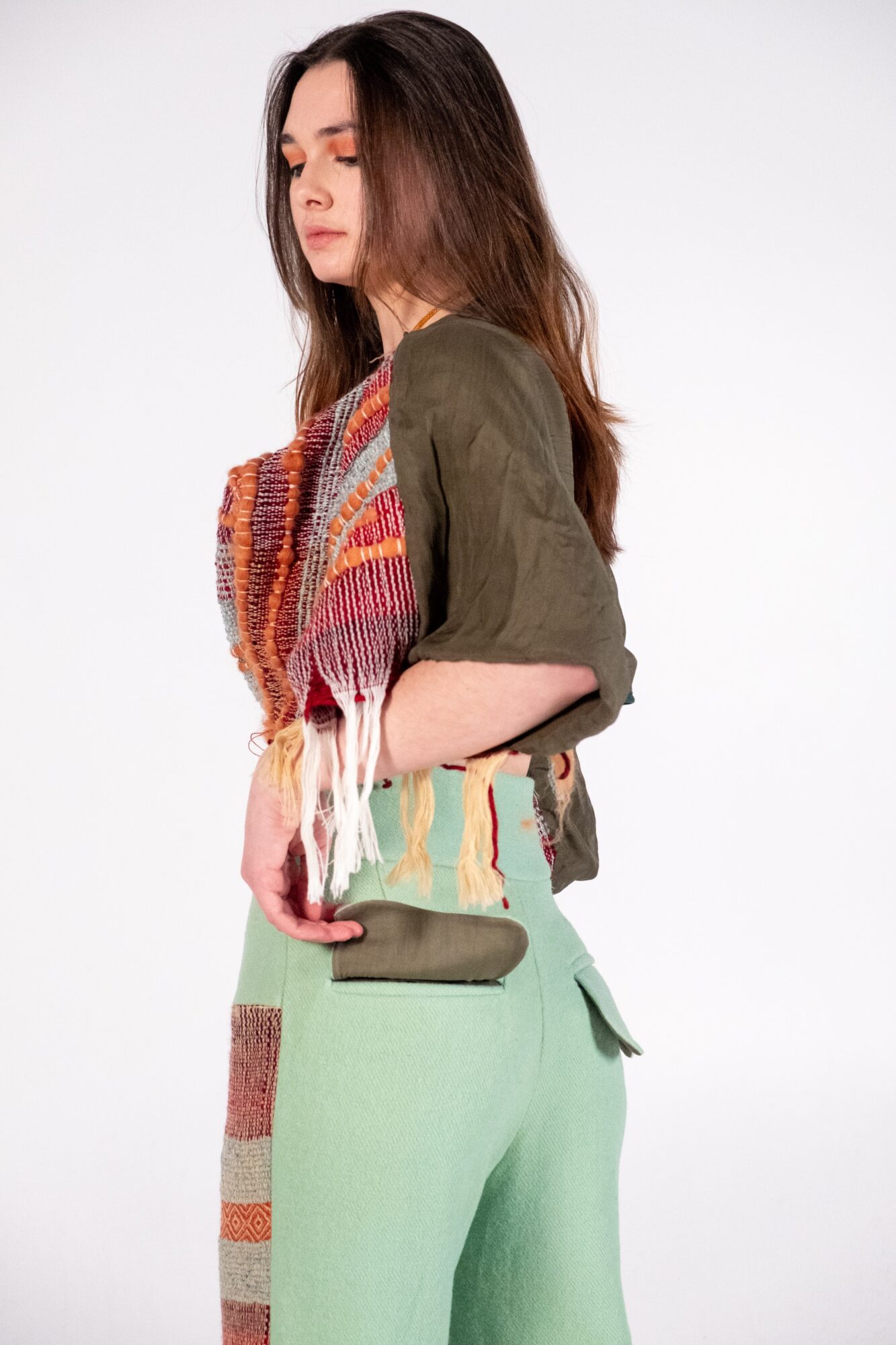 Through the medium of handloom weaving, this collection explores the intersection between fashion and textiles. With a strong focus on sustainable materiality, traditional ways of making are utilised to create environmentally conscious fashion. Natural fibres, second hand fabrics, and handmade ceramic buttons are transformed into contemporary streetwear.