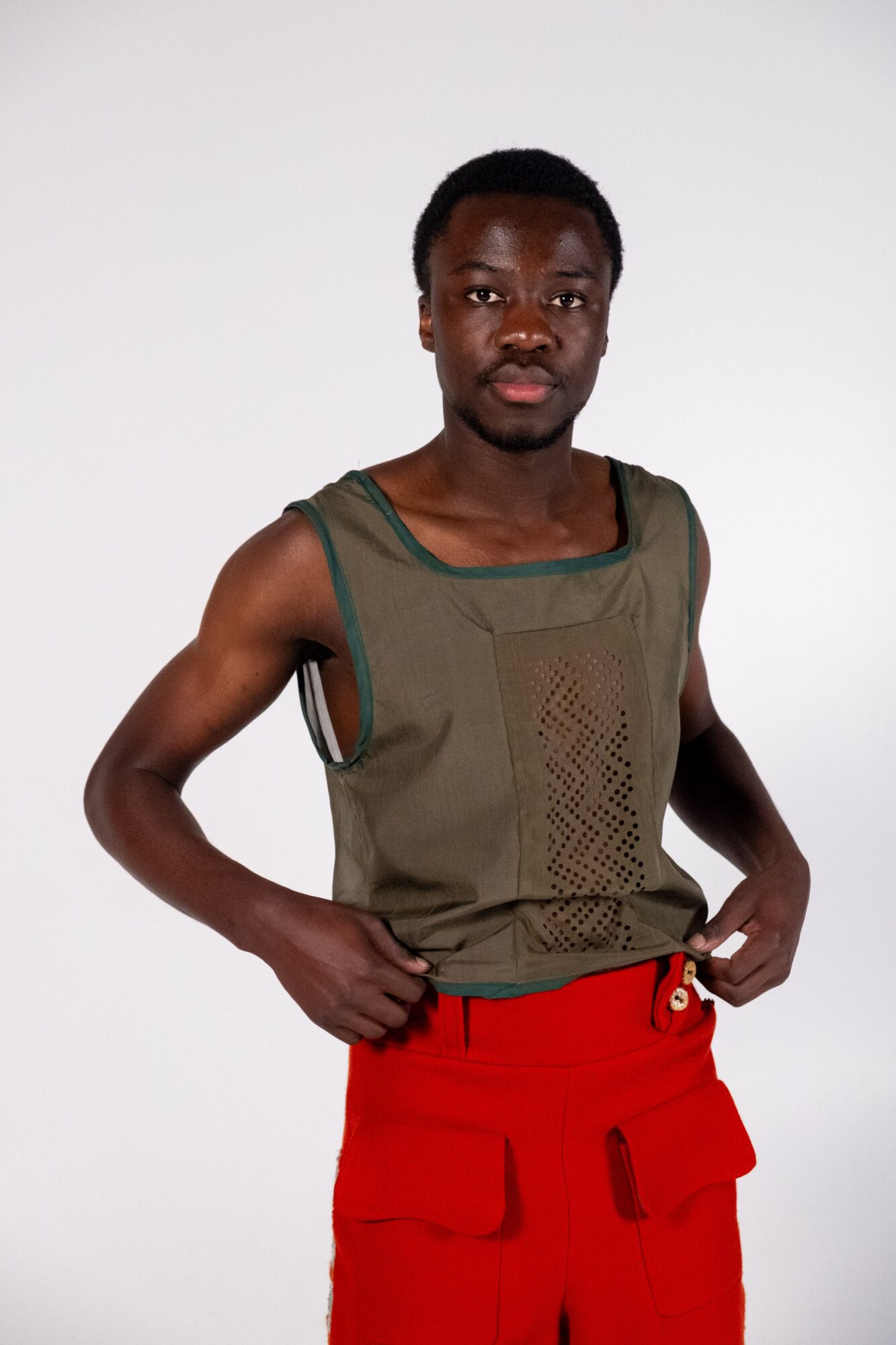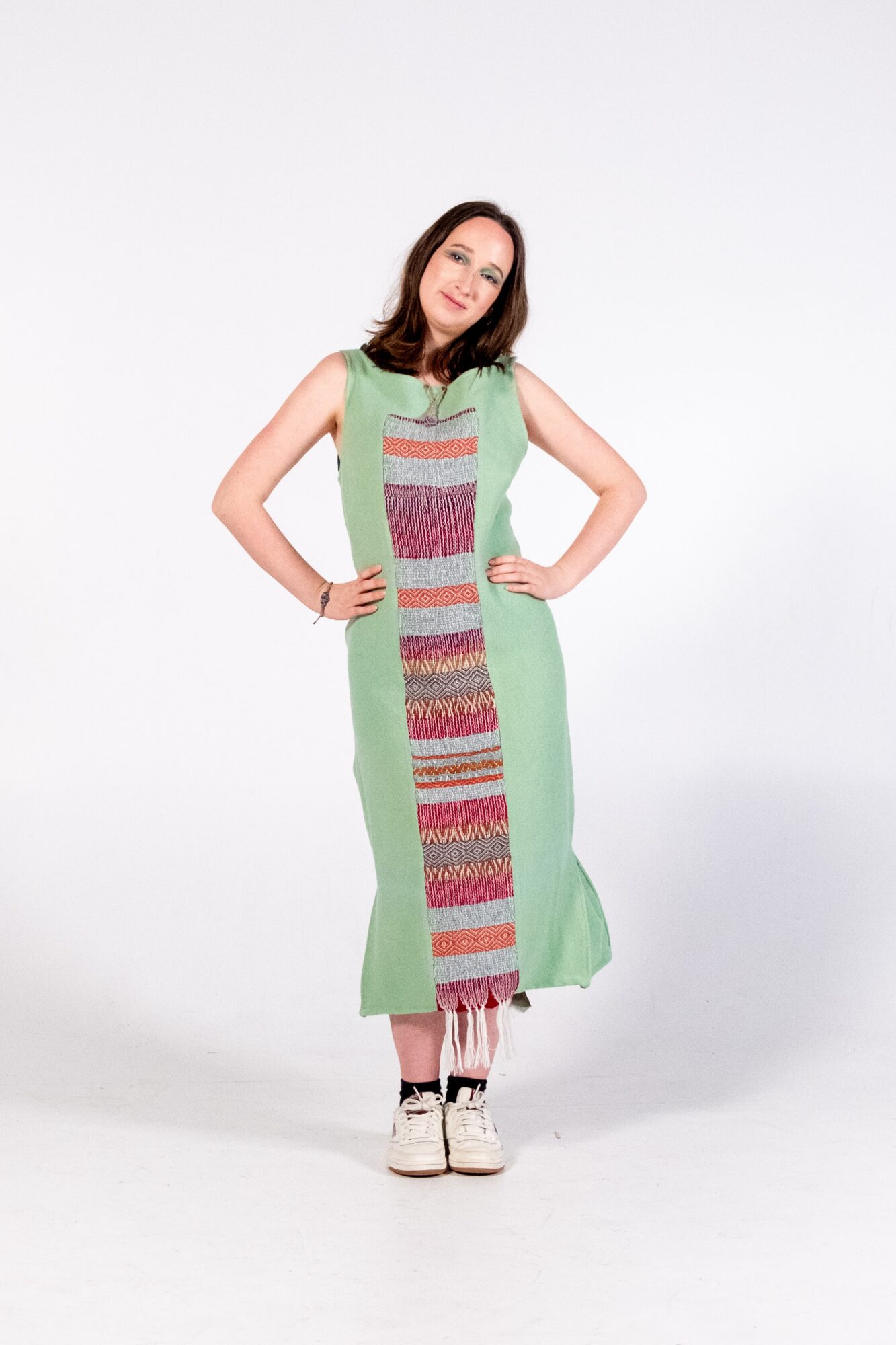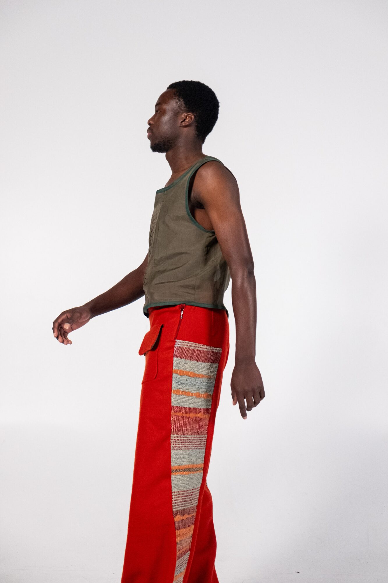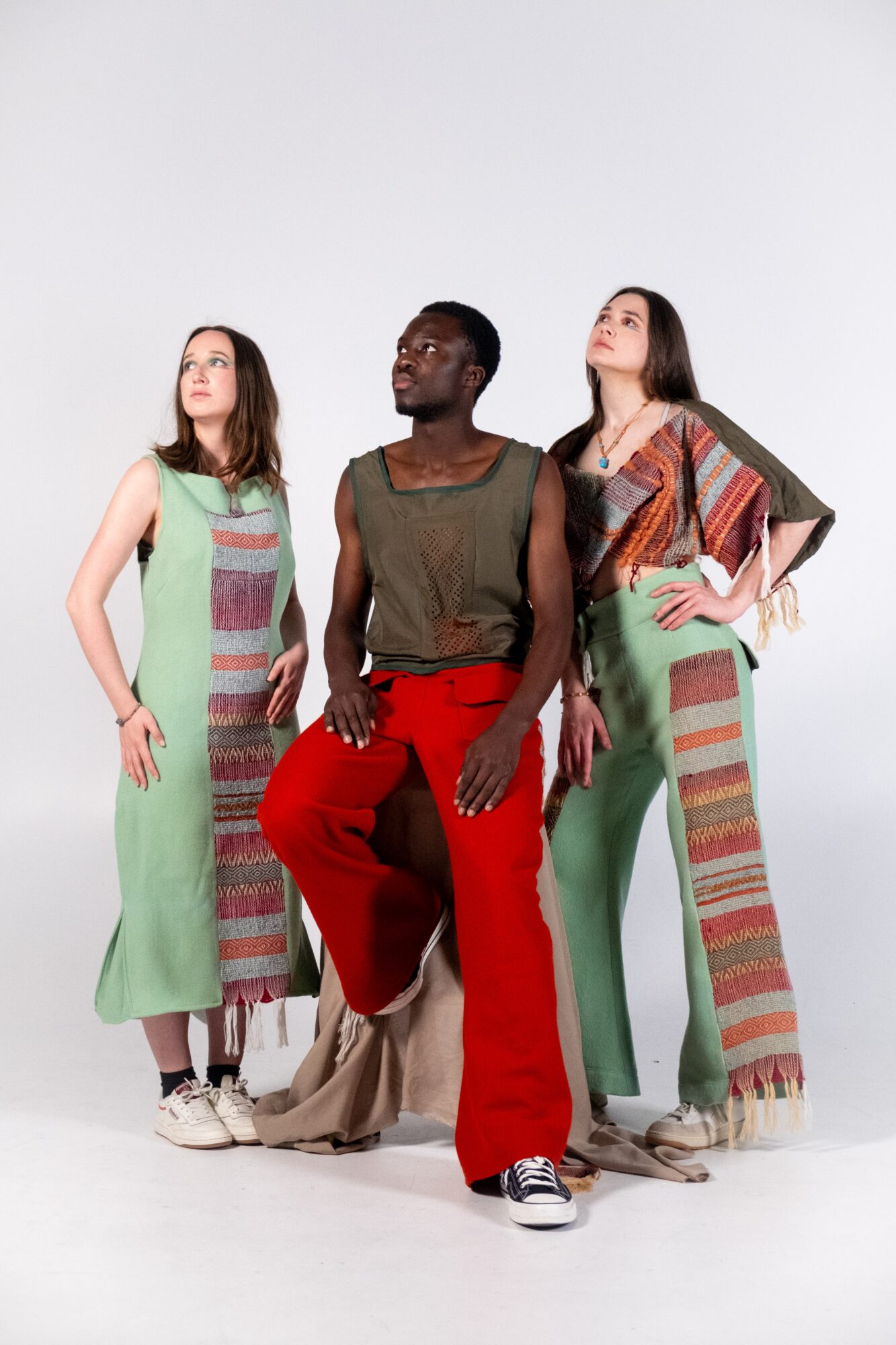 Through the medium of handloom weaving, this collection explores the intersection between fashion and textiles. With a strong focus on sustainable materiality, traditional ways of making are utilised to create environmentally conscious fashion. Natural fibres, second hand fabrics, and handmade ceramic buttons are transformed into contemporary streetwear.